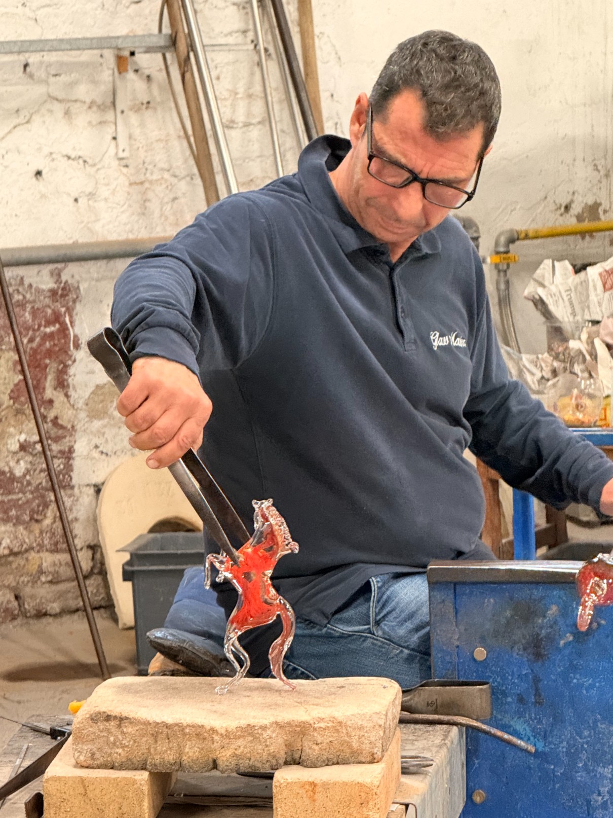 Ostrov skla. Skláři sem byli přesunuti ve 13. století, aby město nevyhořelo, a aby si Benátky uhlídaly tajemství výroby skla. Skláři měli významná privilegia, ale nesměli ostrov opustit. Navštívili jsme jednu z mnoha skláren na krátkou předváděcí ukázku, což bylo moc příjemné (a navíc jsme se v chladném dni i ohřáli 😉).